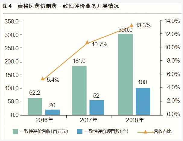 藥智網(wǎng)統(tǒng)計(jì)數(shù)據(jù)顯示,BE臨床新登記月度數(shù)量從2016年8月開始大幅增加,到2018年4月一直保持著較高的數(shù)量,這從側(cè)面反映出一致性評(píng)價(jià)工作正在加速(見圖3)。仿制藥一致性評(píng)價(jià)為CRO行業(yè)帶來了明顯的業(yè)務(wù)增量,以泰格醫(yī)藥為例,2016年,該公司仿制藥一致性評(píng)價(jià)收入約為6220萬(wàn)元,僅占其營(yíng)收總額的5%左右;2017年,來自仿制藥一致性評(píng)價(jià)的業(yè)務(wù)收入大幅提升到1.81億元,同比大增190%,營(yíng)收占比提升到10.7%;2018年全年,預(yù)計(jì)該公司完成了約100個(gè)一致性評(píng)價(jià)項(xiàng)目,營(yíng)業(yè)收入有望超過3億元(見圖4)。