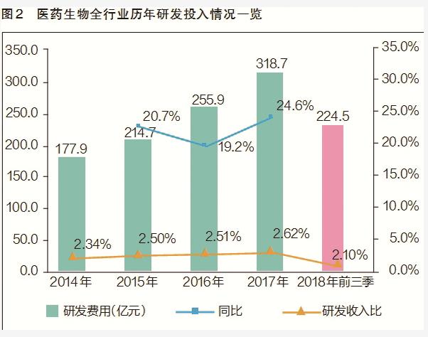 近年來,我國(guó)生物醫(yī)藥行業(yè)上市公司研發(fā)投入持續(xù)加大,不論是絕對(duì)數(shù)還是研發(fā)收入占比,都呈現(xiàn)出上漲趨勢(shì)。2015年,行業(yè)整體研發(fā)投入突破200億元大關(guān),達(dá)到214.7億元,同比增長(zhǎng)20.7%,研發(fā)收入比為2.5%;2016~2017年,研發(fā)投入年增速高于營(yíng)收增速,2017年研發(fā)投入突破300億元,研發(fā)收入比上升到2.62%;2018年前三季度,全行業(yè)研發(fā)投入總額達(dá)到224.5億元,研發(fā)收入比約為2.1%(見圖2)。研發(fā)投入的快速增長(zhǎng),直觀反映出企業(yè)研發(fā)需求的旺盛程度。