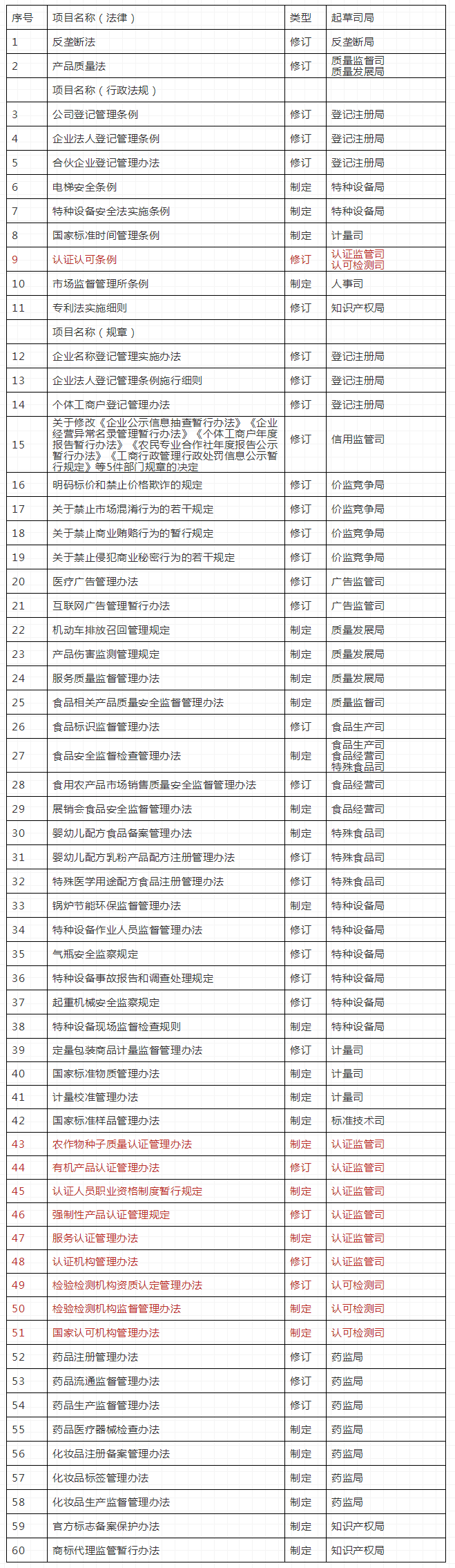 (六)加強(qiáng)立法協(xié)調(diào),推動總局已報送的法律、行政法規(guī)草案順利出臺。積極配合立法機(jī)關(guān),推動計量法、疫苗管理法、藥品管理法、專利法和消費(fèi)者權(quán)益保護(hù)法實(shí)施條例、企業(yè)名稱登記管理?xiàng)l例、個體工商戶條例、食品安全法實(shí)施條例、醫(yī)療器械監(jiān)督管理?xiàng)l例、化妝品監(jiān)督管理?xiàng)l例等已報送審查或提請審議的法律、行政法規(guī)草案制修訂出臺。配合立法機(jī)關(guān)做好機(jī)構(gòu)改革和“放管服”改革等專項(xiàng)法律法規(guī)清理工作。