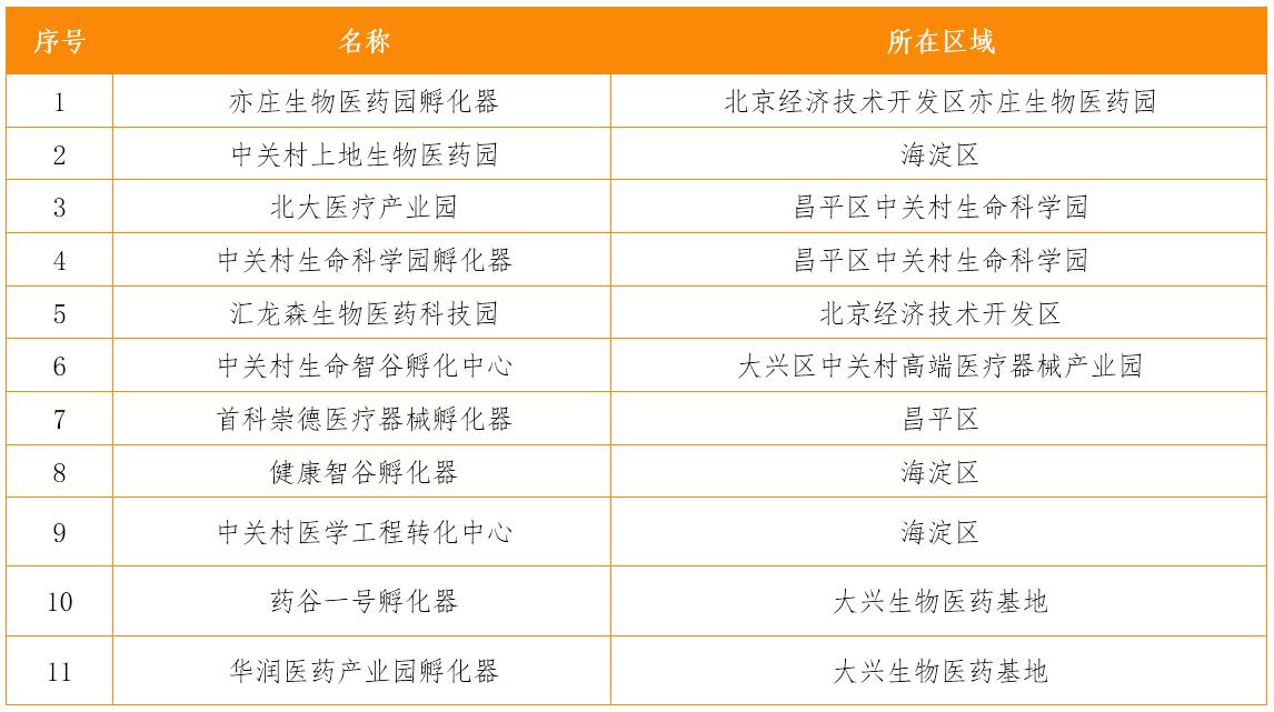 表2 北京市醫(yī)藥健康產業(yè)專業(yè)孵化器