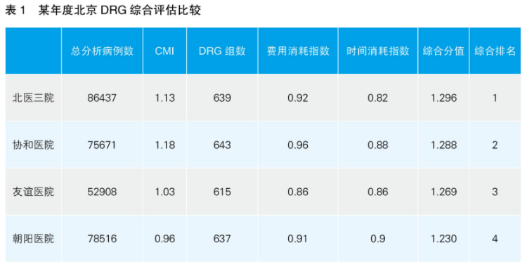 另外,DRG系統(tǒng)中的參數(shù)還可以用來橫向比較各個(gè)醫(yī)院的臨床治療綜合水平。如表1所示,北京協(xié)和醫(yī)院CMI和總DRG組數(shù)(即病例構(gòu)成的寬度)均在所有參比醫(yī)院中處于領(lǐng)先地位,但在綜合參考費(fèi)用和時(shí)間消耗因素上落后,綜合排名位列第二。DRG相關(guān)指標(biāo)能將以前難以量化的醫(yī)療服務(wù)質(zhì)量轉(zhuǎn)變?yōu)榭闪炕闹笜?biāo),使醫(yī)院和科室的雙橫向比較成為可能。而且醫(yī)院和科室之間科學(xué)量化的比較,能使優(yōu)勢醫(yī)院和科室更透明,這將促進(jìn)醫(yī)院科室之間對高新技術(shù)引進(jìn)和應(yīng)用的競爭。
