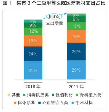 DRG的實(shí)施使藥品和醫(yī)療器械耗材從醫(yī)院的利潤中心轉(zhuǎn)變?yōu)槌杀局行?,從收入來源轉(zhuǎn)變?yōu)榭刭M(fèi)目標(biāo)。據(jù)相關(guān)研究表明,醫(yī)療耗材支出的增長幅度高于醫(yī)院收入的增長,這將導(dǎo)致醫(yī)院對耗材的控費(fèi)更為緊迫。以圖1為例,可收費(fèi)的醫(yī)療耗材的支出,如心血管介入類等占比一直在增加,而不可收費(fèi)的醫(yī)療耗材,如部分手術(shù)材料、消毒供應(yīng)類耗材的采購金額占比則呈明顯下降趨勢。