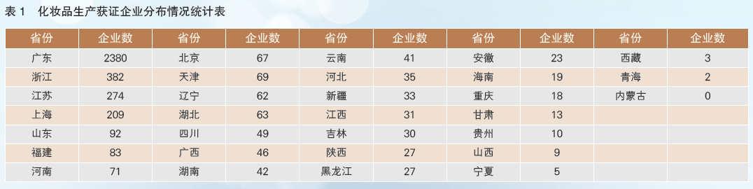 截至2017年12月29日,全國(guó)有4215家化妝品生產(chǎn)企業(yè)取得新的生產(chǎn)許可證,主要分布在廣東、浙江、江蘇、上海。其中,一半以上的企業(yè)位于廣東省,占全國(guó)總量的56.5%。由此可見(jiàn)我國(guó)化妝品產(chǎn)業(yè)分布極不均衡(見(jiàn)表1)。