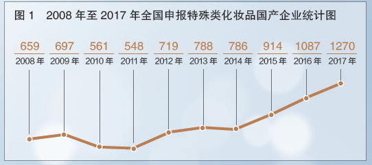 原國(guó)家食藥監(jiān)總局化妝品生產(chǎn)許可信息管理系統(tǒng)服務(wù)平臺(tái)的數(shù)據(jù)顯示,2008年至2017年,全國(guó)申報(bào)特殊類(lèi)化妝品的生產(chǎn)企業(yè)數(shù)量,除2010年和2011年受政策調(diào)整略有下降外,總體呈遞增趨勢(shì)(見(jiàn)圖1)。2017年,更是達(dá)到1270家企業(yè)的申報(bào)記錄,比2008年的659家增長(zhǎng)了92.7%。