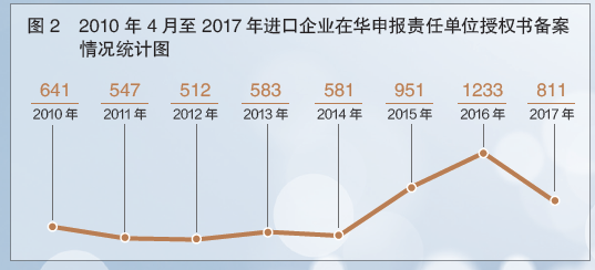 自2010年4月7日首家進(jìn)口企業(yè)法國(guó)歐潤(rùn)芙公司授權(quán)上海法妝商務(wù)咨詢(xún)有限公司作為在華申報(bào)責(zé)任單位的申請(qǐng)通過(guò)備案以來(lái),2011年至2015年的備案情況基本保持穩(wěn)定,2017年呈下降趨勢(shì)。其中,2015年至2016年備案數(shù)逐步上升,究其原因,主要有兩個(gè)方面:一是受856號(hào)文規(guī)定的在華申報(bào)責(zé)任單位授權(quán)書(shū)的授權(quán)有效期至少為4年,自首次進(jìn)行在華申報(bào)責(zé)任單位備案4年后,部分生產(chǎn)企業(yè)因授權(quán)到期而重新授權(quán);二是更多的進(jìn)口企業(yè)進(jìn)行首次授權(quán)備案(見(jiàn)圖2)。