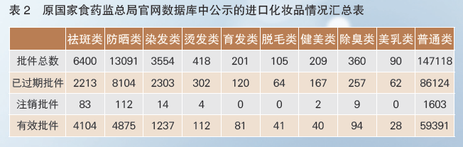 按照產(chǎn)品和產(chǎn)品類(lèi)別來(lái)統(tǒng)計(jì),截至2017年11月3日,原國(guó)家食藥監(jiān)總局官網(wǎng)數(shù)據(jù)庫(kù)中公示的信息顯示,監(jiān)管部門(mén)共批準(zhǔn)國(guó)產(chǎn)特殊用途化妝品總批件33243件,其中過(guò)期產(chǎn)品批件21503件,注銷(xiāo)產(chǎn)品批件141件,有效產(chǎn)品批件11599件;共批準(zhǔn)進(jìn)口特殊用途化妝品172750件,其中過(guò)期產(chǎn)品批件102588件,注銷(xiāo)產(chǎn)品批件1817件,有效產(chǎn)品批件68345件(見(jiàn)表2)。