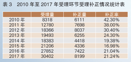 同時(shí),統(tǒng)計(jì)化妝品受理環(huán)節(jié)的受理量和補(bǔ)正量(不含延期再審、申請(qǐng)復(fù)核、完善資料)可以發(fā)現(xiàn),從2010年至2015年,化妝品受理環(huán)節(jié)的補(bǔ)正率逐步降低;2016至2017年的補(bǔ)正量略有上升。造成這一現(xiàn)象的主要原因是政策的變化,分別是2010年4月1日起施行的856號(hào)文、2011年4月1日起施行的《關(guān)于實(shí)施化妝品產(chǎn)品技術(shù)要求規(guī)范有關(guān)問(wèn)題的通知》和2016年12月1日施行的新版《化妝品安全技術(shù)規(guī)范》(見(jiàn)表3)。