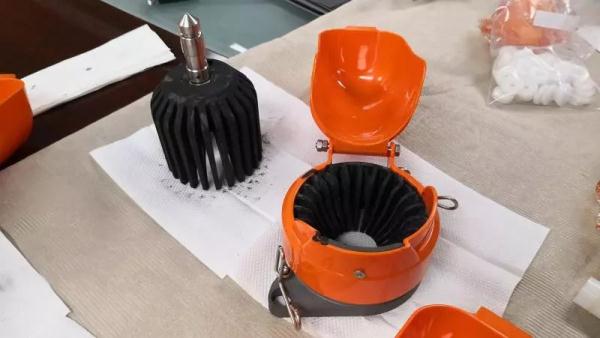 首先,工作人員在“上下爪”的鋁合金部位均勻涂上了黑色油墨,放入一只橙子現(xiàn)榨,有橙汁流出,但油墨并沒有滲入。隨后進行的兩次試驗結(jié)果均相同。為了進行對比,工作人員又將“上下爪”的所有部位都涂上了黑色油墨,這次橙汁中泛出了淡黑色。