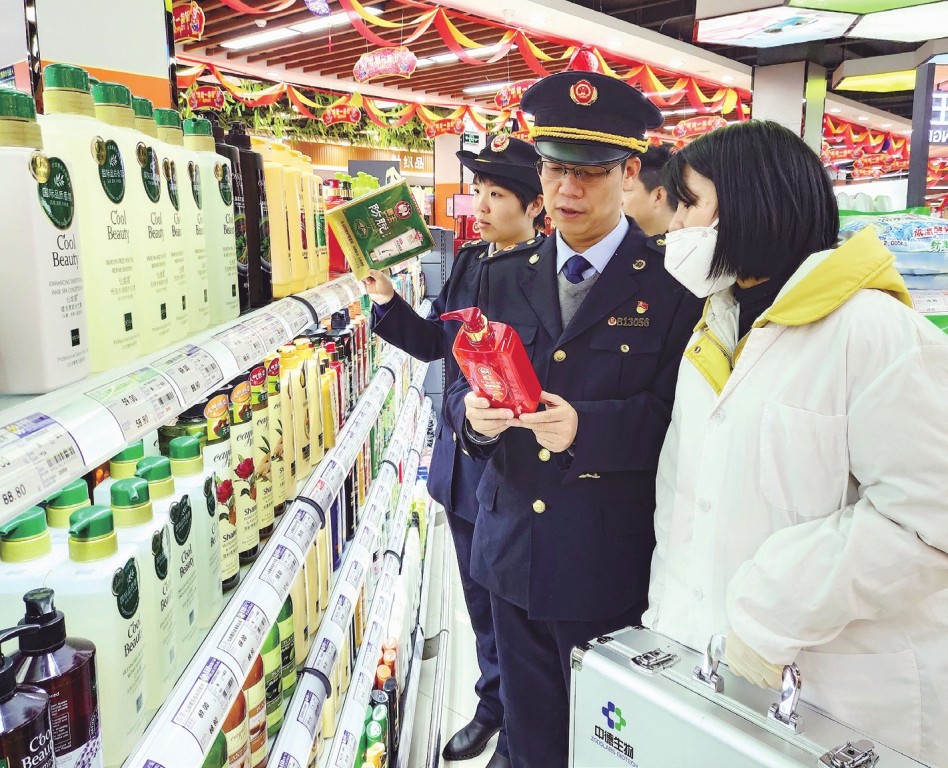 近日,江西省于都縣市場監(jiān)管局組織開展了超市、商場、專賣店、藥店化妝品安全檢查,重點對祛斑美白、祛痘、面膜、防曬類化妝品及燙染發(fā)產品進行針對性檢查,及時發(fā)現(xiàn)化妝品安全隱患,保障產品質量安全。圖為該局執(zhí)法人員在一家超市檢查。王雨林 謝峰 攝