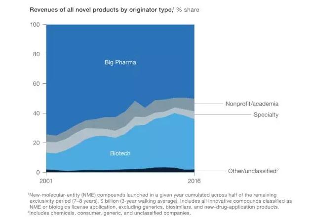 隨著生物技術(shù)公司的異軍突起,創(chuàng)新的來源逐漸從大藥企轉(zhuǎn)移到生物技術(shù)公司的實驗室。據(jù)德勤報告,2018年12家頭部生物醫(yī)藥公司通過藥物研發(fā)創(chuàng)新獲得的回報僅為1.9%,而同期小型??扑幧锛夹g(shù)公司則達(dá)到9.3%。麥肯錫另一份統(tǒng)計報告也說明了近15年,研發(fā)源頭來自大藥企外部的創(chuàng)新產(chǎn)品年收入份額已經(jīng)從2001年的25%上升到2016年的50%,表明了生物技術(shù)公司的強大活力。