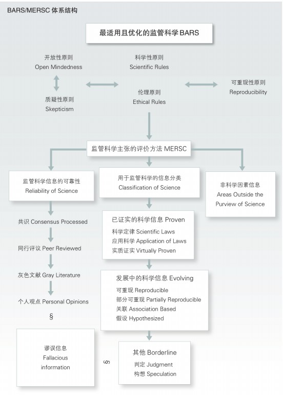 為此,美國(guó)監(jiān)管科學(xué)研究機(jī)構(gòu)的專家提出了以下兩個(gè)概念:“Best Available Regulatory Science (BARS)”,以及由此演化的概念“Metrics for Evaluation of Regulatory Scientific Claims(MERSC)”。筆者沒(méi)有找到上述概念的權(quán)威翻譯,BARS暫且直譯為 “最適用且優(yōu)化的監(jiān)管科學(xué)”,MERSC意譯為“監(jiān)管科學(xué)主張的評(píng)價(jià)方法”,它們是監(jiān)管科學(xué)的主要工具。BARS及MERSC示意圖見(jiàn)右圖,從圖中可以直觀地看出BARS的五個(gè)原則、MERSC的三個(gè)工具,它們是評(píng)判監(jiān)管過(guò)程所依據(jù)的科學(xué)主張的正確性和可靠性的原則、工具和方法。