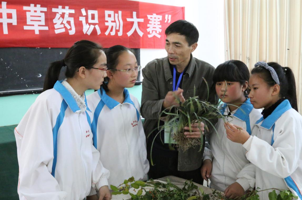 云臺(tái)中學(xué)鄉(xiāng)土中草藥識(shí)別大賽,吳舟在給同學(xué)們作輔導(dǎo)。