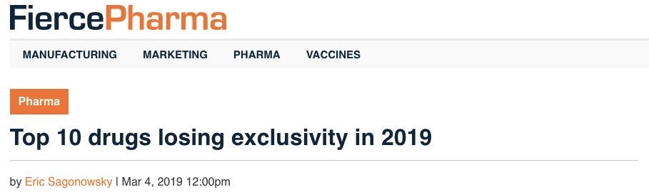 3月4日,國外醫(yī)藥網(wǎng)站FiercePharma發(fā)布了一份2019年可能面臨專利挑戰(zhàn)風(fēng)險的十大藥物清單。