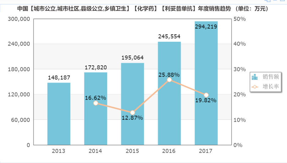 美羅華由羅氏銷售,2017年全球銷售額為79億美元,其中美國市場銷售額44.1億美元,該藥美國市場專利保護截止日期為2018年年中至年底。