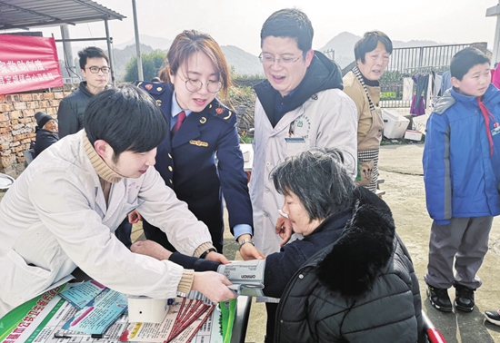 近日,浙江省寧波市定塘市場監(jiān)管所工作人員攜手定塘鎮(zhèn)中心衛(wèi)生院、象山縣藥學(xué)會(huì)的志愿者走進(jìn)定塘鎮(zhèn)敬老院,為老人們免費(fèi)測量血壓、血糖,普及安全用藥用械知識(shí)。(陳挺 攝)