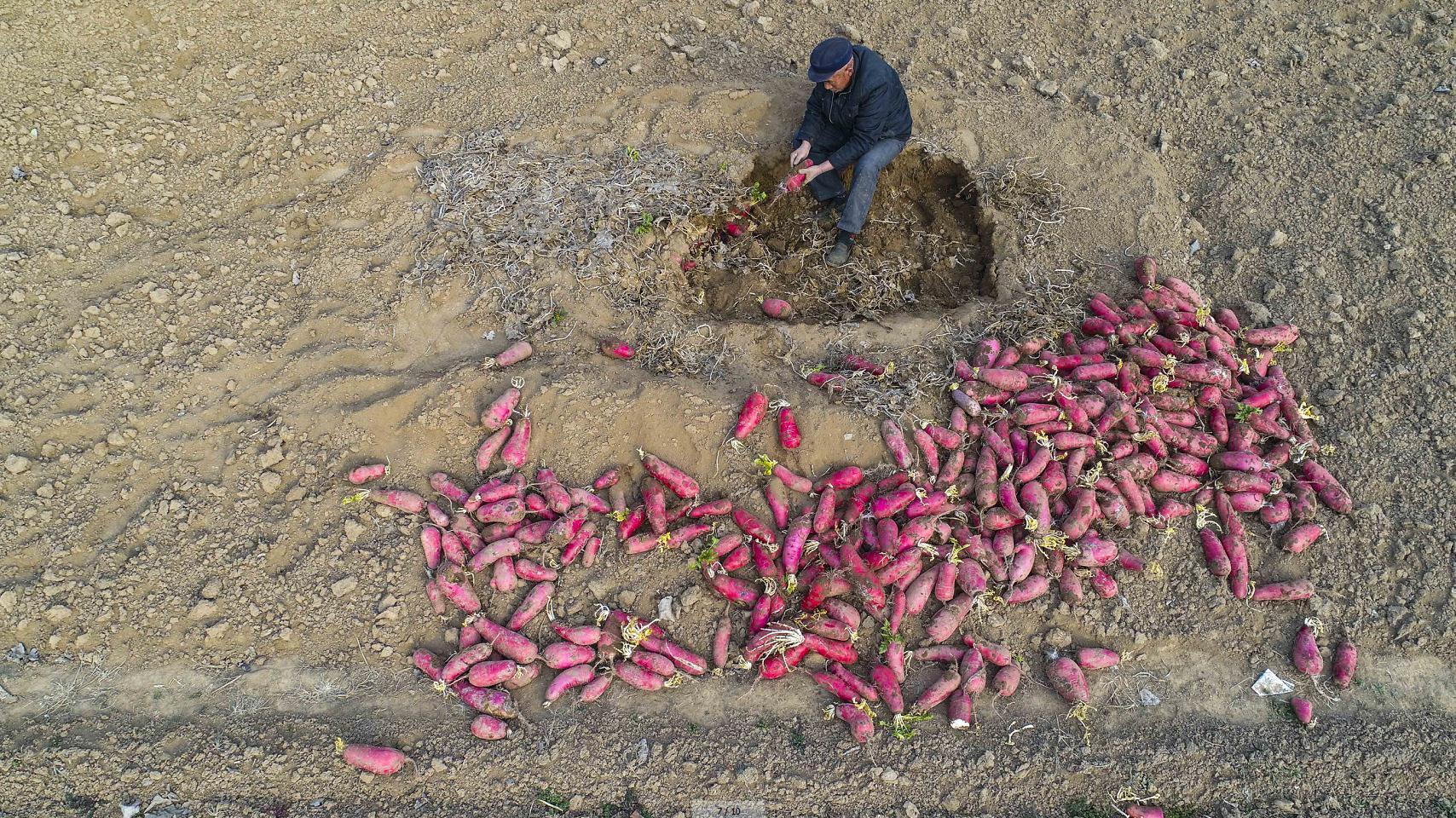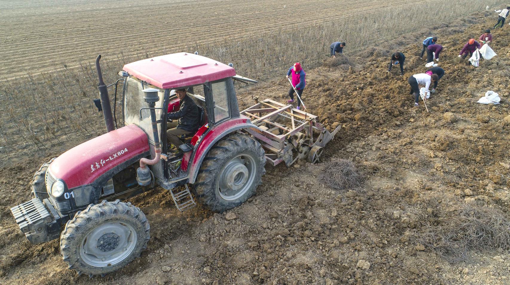 3月10日,在安徽省亳州市譙城區(qū)華佗鎮(zhèn)邢閣村,農(nóng)民在收獲中藥材何首烏。劉勤利 攝(無(wú)人機(jī)航拍)