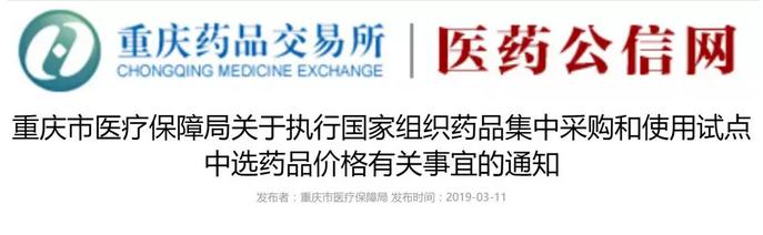 3月11日,重慶市醫(yī)保局發(fā)布通知,從2019年3月20日起,醫(yī)療機(jī)構(gòu)向患者銷售4+7集采中選藥品的價(jià)格按調(diào)整后的中選價(jià)格執(zhí)行。
