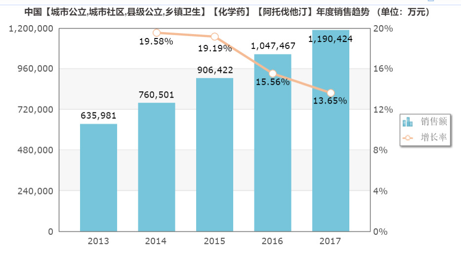 以阿托伐他汀鈣片為例,根據(jù)米內(nèi)網(wǎng)數(shù)據(jù),阿托伐他汀鈣片在中國的市場規(guī)模近119億,增長率放緩。