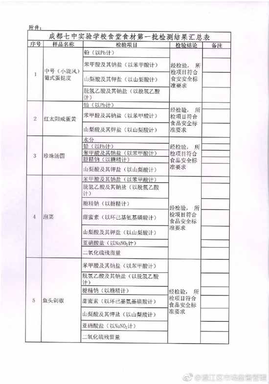 檢測結(jié)果:成都七中實(shí)驗(yàn)學(xué)校食堂首批食材抽檢合格(第一批5個(gè)樣品)