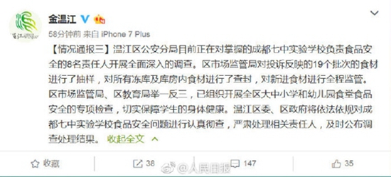 總局回應(yīng):要求調(diào)查成都市七中實(shí)驗(yàn)學(xué)校食品安全問題