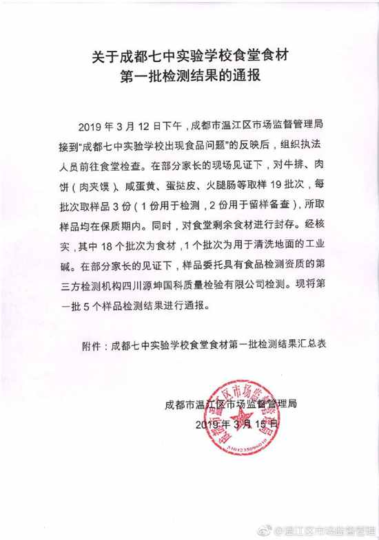 2019年3月12日下午,成都市溫江區(qū)市場監(jiān)督管理局接到“成都七中實(shí)驗(yàn)學(xué)校出現(xiàn)食品問題”的反映后,組織執(zhí)法人員前往食堂檢查。在部分家長的現(xiàn)場見證下,對(duì)牛排、肉餅(肉夾饃)、咸蛋黃、蛋撻皮、火腿腸等取樣19批次,每批次取樣品3份(1份用于檢測,2份用于留樣備查),所取樣品均在保質(zhì)期內(nèi)。同時(shí),對(duì)食堂剩余食材進(jìn)行封存。經(jīng)核實(shí),其中18個(gè)批次為食材,1個(gè)批次為用于清洗地面的工業(yè)堿。在部分家長的見證下,樣品委托具有食品檢測資質(zhì)的第三方檢測機(jī)構(gòu)四川源坤國科質(zhì)量檢驗(yàn)有限公司檢測?,F(xiàn)將第一批5個(gè)樣品檢測結(jié)果進(jìn)行通報(bào)。