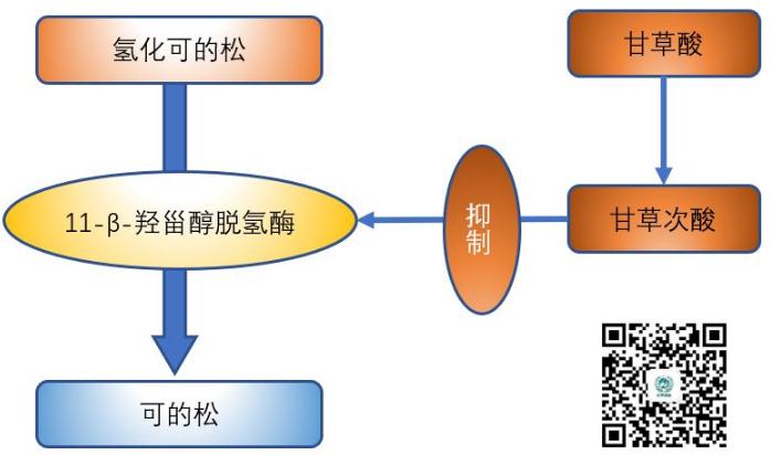 甘草酸可水解為甘草次酸,甘草次酸可抑制氫化可的松氧化酶(11-β-羥甾醇脫氫酶),造成體內(nèi)氫化可的松水平升高,從而引起水鈉潴留和低血鉀。