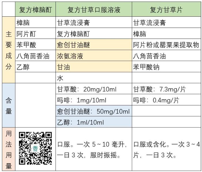 甘草流浸膏、樟腦、阿片、八角茴香油、苯甲酸;不同成分:愈創(chuàng)甘油醚、濃氨溶液、乙醇、甘油(見下表)。
