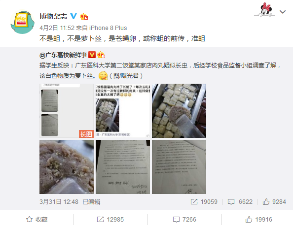 4月2日,在微博上極具影響力的千萬粉絲博主“博物雜志”指出,圖片中的不明物體不是蛆,不是蘿卜絲,是蒼蠅卵,或稱蛆的前傳,準蛆。再度引發(fā)網(wǎng)民的討論。此外,另據(jù)媒體報道學校已就學生反映的問題介入調(diào)查,調(diào)查過程中有學生代表參與,學校已經(jīng)要求楊國福麻辣燙停業(yè),將所有食材封存,另據(jù)初步檢測,楊國福麻辣燙店內(nèi)食材中沒有發(fā)現(xiàn)問題。