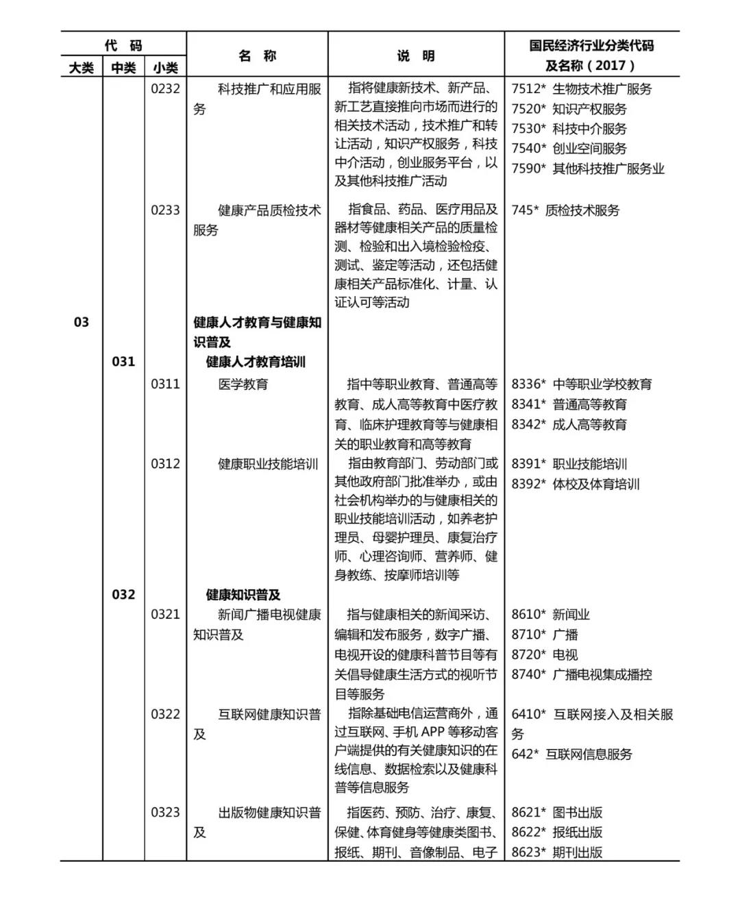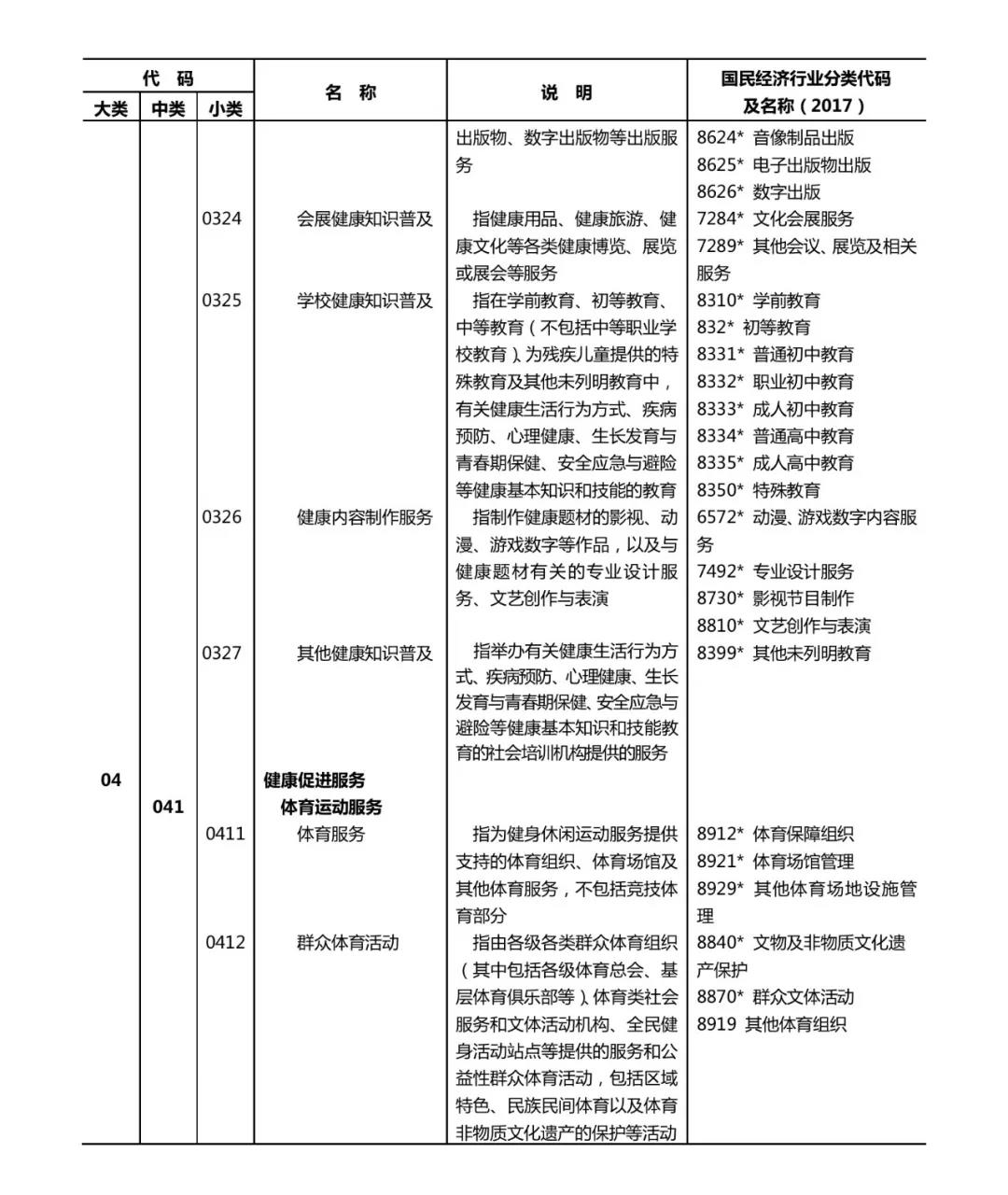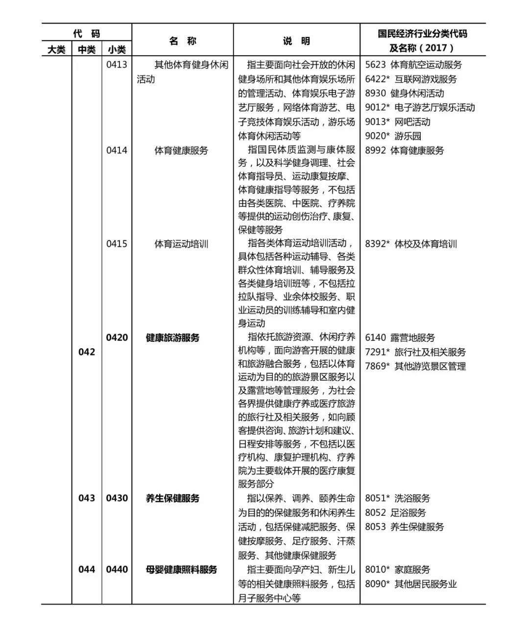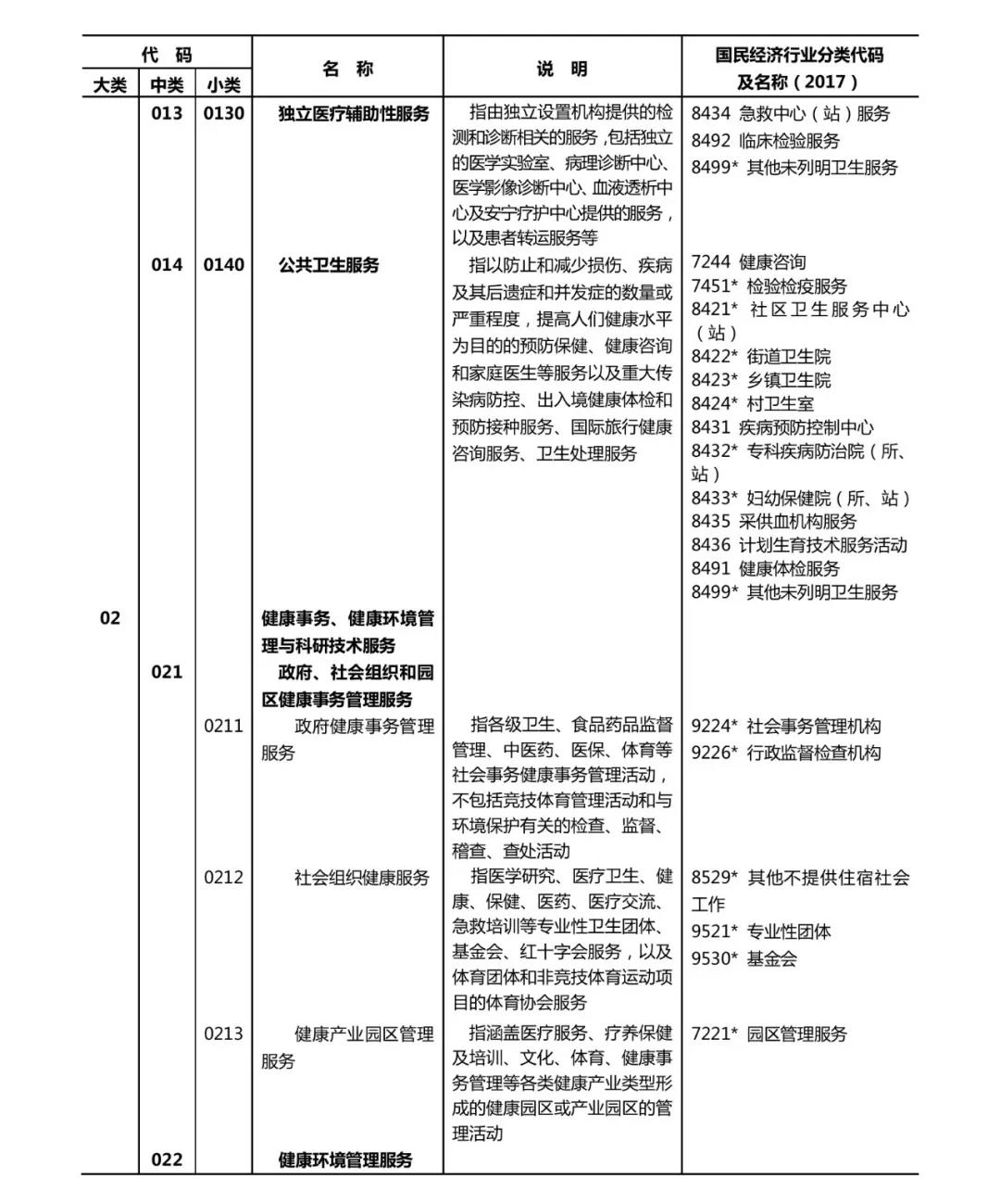 ?。ㄒ唬┍痉诸惤⒘伺c《國民經濟行業(yè)分類》(GB/T 4754-2017)的對應關系。在國民經濟行業(yè)分類中僅部分活動屬于健康產業(yè)的,行業(yè)代碼用“*”做標記。