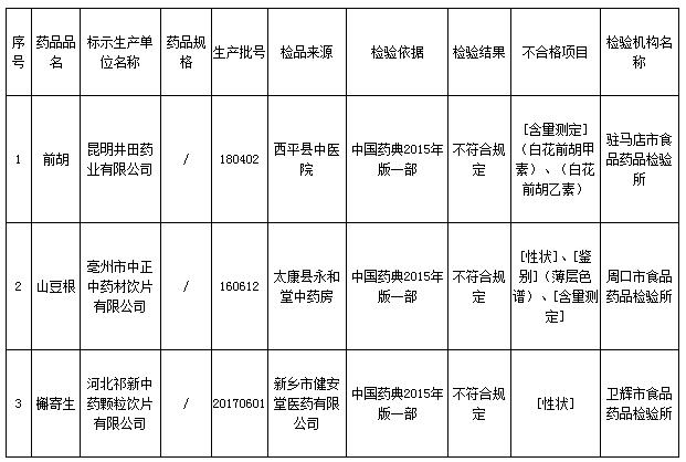 通告稱,經(jīng)駐馬店市食品藥品檢驗(yàn)所檢驗(yàn),標(biāo)示為昆明井田藥業(yè)有限公司生產(chǎn)的前胡(批號(hào)180402)不合格,不合格項(xiàng)目為含量測(cè)定。經(jīng)周口市食品藥品檢驗(yàn)所檢驗(yàn),標(biāo)示為亳州市中正中藥材飲片有限公司生產(chǎn)的山豆根(批號(hào)160612)不合格,不合格項(xiàng)目為性狀、鑒別、含量測(cè)定。經(jīng)衛(wèi)輝市食品藥品檢驗(yàn)所檢驗(yàn),標(biāo)示為河北祁新中藥顆粒飲片有限公司生產(chǎn)的槲寄生(批號(hào)20170601)不合格,不合格項(xiàng)目為性狀。