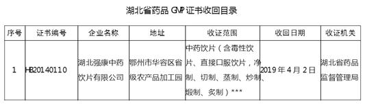 湖北省藥監(jiān)局收回湖北強(qiáng)康中藥飲片有限公司藥品GMP證書