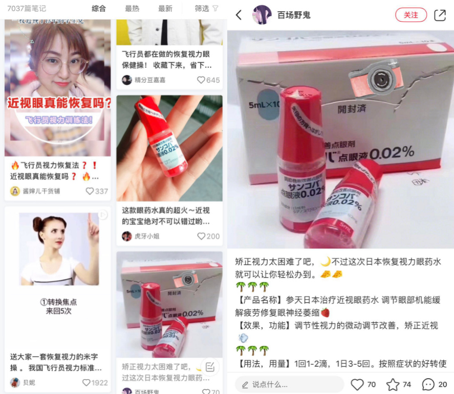 在小紅書(shū)平臺(tái),以“恢復(fù)視力”為關(guān)鍵詞進(jìn)行搜索,結(jié)果顯示有7037篇筆記,亦有部分分享者聲稱(chēng)使用“日本參天調(diào)解眼機(jī)能眼藥水”可以恢復(fù)視力。