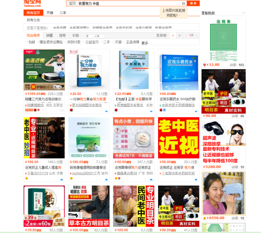 圖為淘寶搜索“中醫(yī)近視”“恢復(fù)近視 中醫(yī)”等關(guān)鍵詞的搜索結(jié)果。