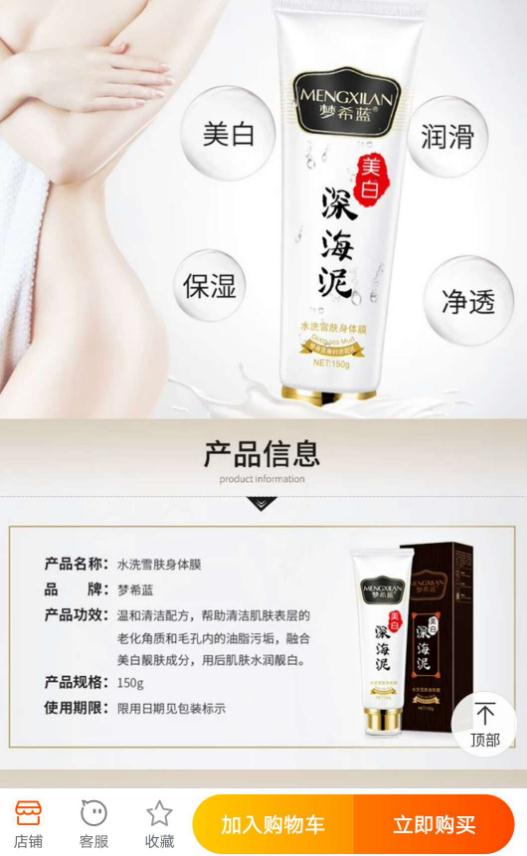 品牌為“夢希藍”的“美白潔面乳”,在店家展示的產品信息圖片中卻標示產品名稱為“水洗雪膚身體膜”。