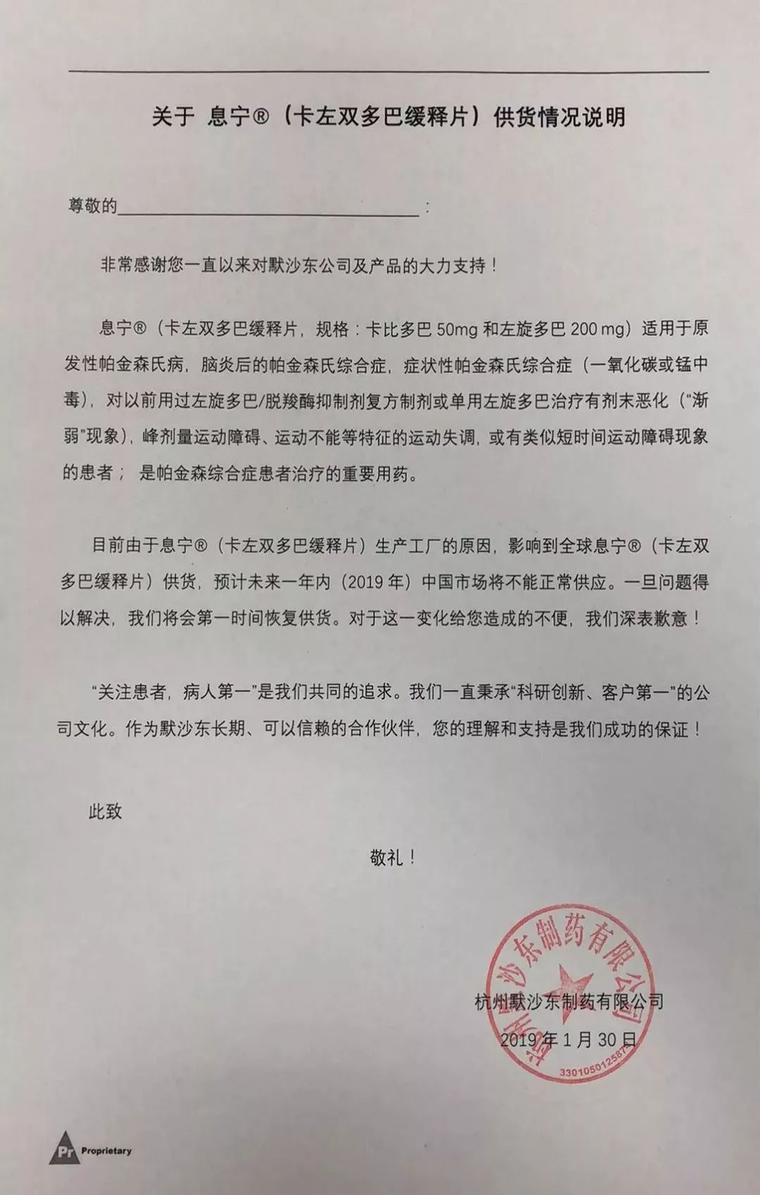 息寧是一款常用的帕金森治療藥物,由默沙東生產(chǎn)。據(jù)杭州默沙東制藥有限公司發(fā)出的卡左雙多巴緩釋片(息寧)供貨情況說明,該藥由于生產(chǎn)工廠的原因影響到全球供貨,預(yù)計(jì)今年年內(nèi)中國市場將不能正常供應(yīng)。