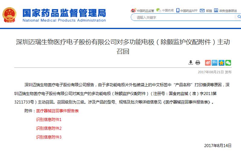 2017年8月21日,國家藥品監(jiān)管部門官網(wǎng)發(fā)布《深圳邁瑞生物醫(yī)療電子股份有限公司對多功能電極(除顫監(jiān)護(hù)儀配附件)主動召回》信息(信息鏈接為http://www.nmpa.gov.cn/WS04/CL2135/321102.html),“深圳邁瑞生物醫(yī)療電子股份有限公司報告,由于多功能電極片外包裝袋上的中文標(biāo)簽中“產(chǎn)品名稱”打印錯誤等原因,深圳邁瑞生物醫(yī)療電子股份有限公司對其生產(chǎn)的多功能電極(除顫監(jiān)護(hù)儀配附件)(注冊號:國食藥監(jiān)械(準(zhǔn))字2013第3211733號)主動召回,召回級別三級?!?/p>