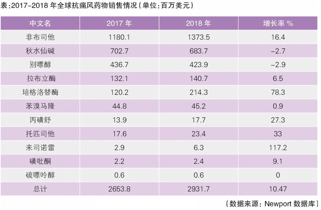 據(jù)Newport數(shù)據(jù),2017~2018年,全球11種主要抗痛風(fēng)藥物的銷售額合計(jì)已達(dá)29.3億美元,同比增長(zhǎng)10.47%。其中,非布司他、秋水仙堿和別嘌醇的銷售額排在前三,而非布司他、培格洛替酶、托匹司他和來(lái)司諾雷的增長(zhǎng)勢(shì)頭明顯(見(jiàn)表)。國(guó)內(nèi)市場(chǎng)方面,據(jù)米內(nèi)數(shù)據(jù)顯示,2017年我國(guó)城市公立醫(yī)院抗痛風(fēng)藥物的銷售額已達(dá)7.79億元,同比增長(zhǎng)65.57%,2013~2017年復(fù)合增長(zhǎng)率高達(dá)43.3%。盡管該治療領(lǐng)域市場(chǎng)規(guī)模較小,但該領(lǐng)域具有較大的市場(chǎng)潛力。