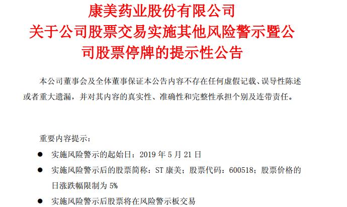 中國食品藥品網(wǎng)訊(記者 落楠) 5月17日晚,康美藥業(yè)發(fā)布公告稱,公司股票將于2019年5月21日起實施其他風(fēng)險警示,實施風(fēng)險警示后A股股票簡稱由“康美藥業(yè)”變更為“ST康美”,股票價格的日漲跌幅限制為5%。5月20日,康美藥業(yè)股票停牌1天,但康美藥業(yè)發(fā)行的公司債券“15康美債”三度狂跌,兩度暫停交易。