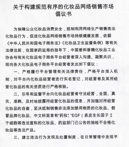 為促進(jìn)化妝品網(wǎng)絡(luò)銷(xiāo)售市場(chǎng)持續(xù)健康發(fā)展,國(guó)家藥監(jiān)局化妝品監(jiān)管司充分調(diào)動(dòng)行業(yè)積極性,指導(dǎo)中國(guó)香料香精化妝品工業(yè)協(xié)會(huì)發(fā)布《關(guān)于構(gòu)建規(guī)范有序的化妝品網(wǎng)絡(luò)銷(xiāo)售市場(chǎng)倡議書(shū)》(以下簡(jiǎn)稱(chēng)《倡議書(shū)》)。《倡議書(shū)》于4月17日發(fā)布,隨后阿里巴巴、京東、聚美優(yōu)品、唯品會(huì)、網(wǎng)易嚴(yán)選、網(wǎng)易考拉、拼多多、小紅書(shū)8家主流化妝品電子商務(wù)平臺(tái)相繼簽署承諾書(shū),承諾將嚴(yán)格履行電商平臺(tái)管理有關(guān)法律責(zé)任,自覺(jué)抵制利用網(wǎng)絡(luò)生產(chǎn)銷(xiāo)售違法化妝品行為。4月30日,國(guó)家藥監(jiān)局又在全國(guó)范圍內(nèi)部署開(kāi)展“線上凈網(wǎng)線下清源”專(zhuān)項(xiàng)工作,排查處置化妝品網(wǎng)絡(luò)銷(xiāo)售市場(chǎng)安全風(fēng)險(xiǎn),督促化妝品網(wǎng)絡(luò)銷(xiāo)售者和化妝品電子商務(wù)平臺(tái)經(jīng)營(yíng)者落實(shí)化妝品經(jīng)營(yíng)者主體責(zé)任。5月伊始,上述8家電子商務(wù)平臺(tái)又同步上線化妝品消費(fèi)提示語(yǔ)“國(guó)家藥監(jiān)局提示您:請(qǐng)正確認(rèn)識(shí)化妝品功效,化妝品不能替代藥品,不能治療皮膚病等疾病”,提醒廣大消費(fèi)者防范化妝品消費(fèi)風(fēng)險(xiǎn)。