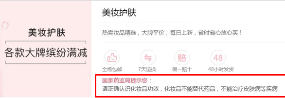 中國(guó)食品藥品網(wǎng)訊(記者 陳燕飛) “國(guó)家藥監(jiān)局提示您:請(qǐng)正確認(rèn)識(shí)化妝品功效,化妝品不能替代藥品,不能治療皮膚病等疾病”,5月23日,記者隨意打開(kāi)一個(gè)化妝品購(gòu)物網(wǎng)站,這樣的消費(fèi)提示就出現(xiàn)在選購(gòu)頁(yè)面。這是電商平臺(tái)主動(dòng)履行主體責(zé)任的一個(gè)縮影。