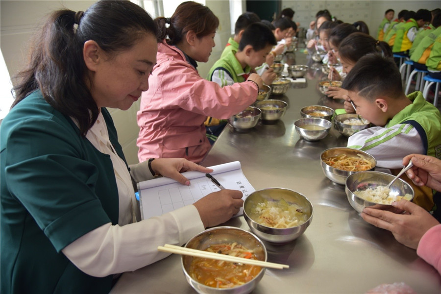 圖為兒童節(jié)前夕,開封市二師附小校長(zhǎng)馮東輝在陪同學(xué)生就餐,并認(rèn)真填寫陪餐記錄。韓吳琦 攝