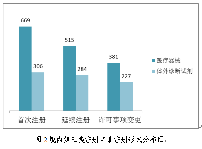 從注冊形式看,首次注冊599項,占全部境內第三類醫(yī)療器械注冊數(shù)量的35.0%,延續(xù)注冊543項,占全部境內第三類醫(yī)療器械注冊數(shù)量的31.8%;許可事項變更注冊567項,占全部境內第三類醫(yī)療器械注冊數(shù)量的33.2%。注冊形式分布情況見圖7。