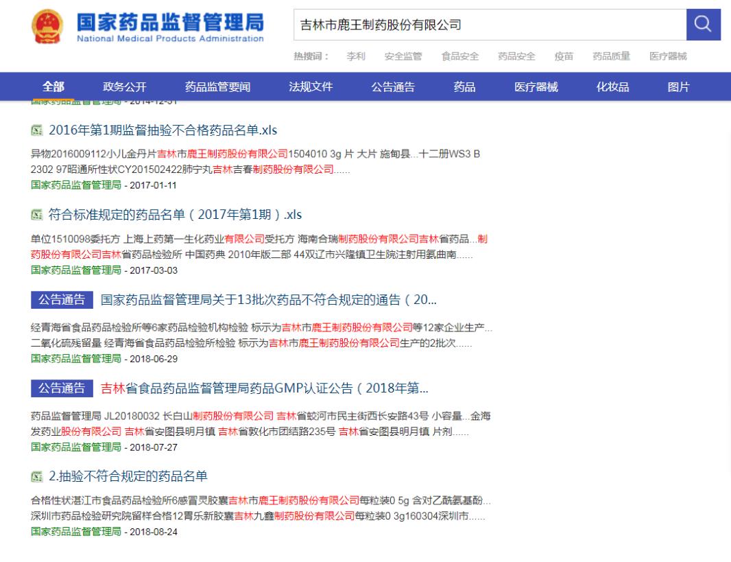 記者查閱國家藥監(jiān)局官網得知,在2018年8月24日、2018年7月3日、2018年2月13日、2017年1月11日國家藥品監(jiān)管部門發(fā)布的藥品不合格名單與不符合標準規(guī)定的藥品名單中,都出現(xiàn)了標示為吉林市鹿王制藥股份有限公司生產的產品。