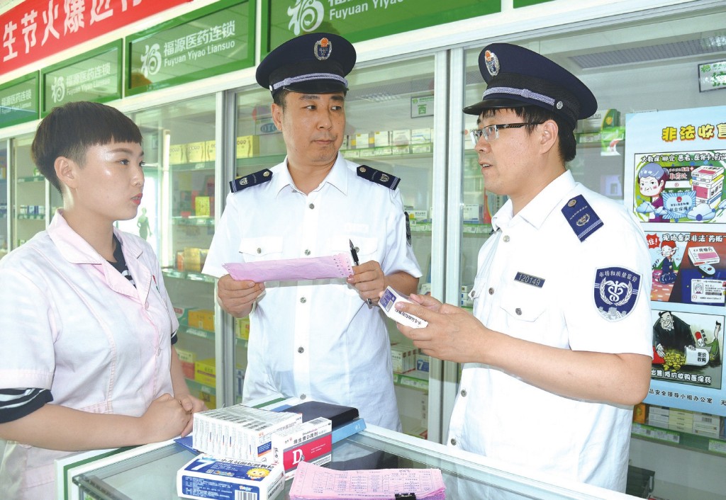 圖為執(zhí)法人員在一家藥店檢查,核對藥品進(jìn)貨票據(jù)。董寶栓 攝