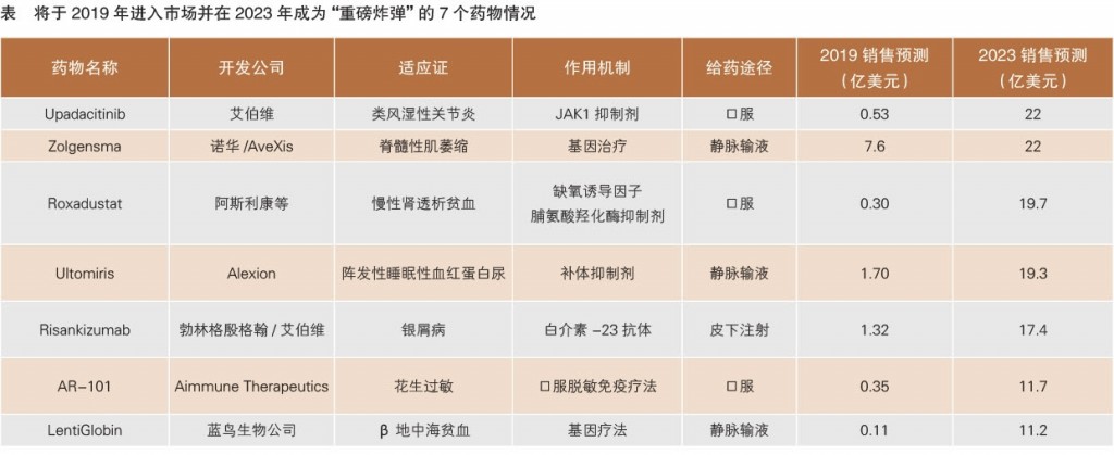 科睿唯安的Cortellis團隊日前發(fā)布報告,預(yù)測2019年度最值得關(guān)注的藥物有7個(見表),它們上市后5年內(nèi)的銷售額有望達到“重磅炸彈”級別(達到或超過10億美元)。