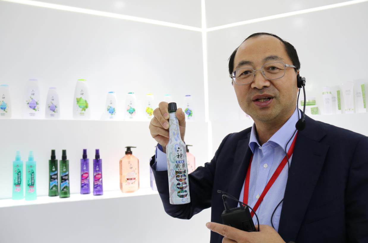 工作人員向記者們展示限量版的“六神”花露水。