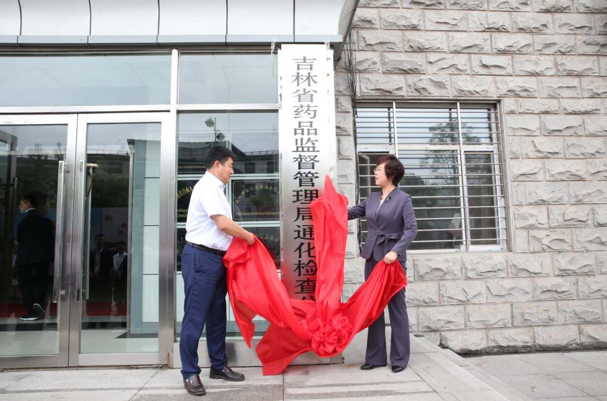 圖為吉林省藥監(jiān)局局長劉寶芳與通化市委常委、常務(wù)副市長經(jīng)希軍為吉林省藥監(jiān)局通化檢查分局揭牌。