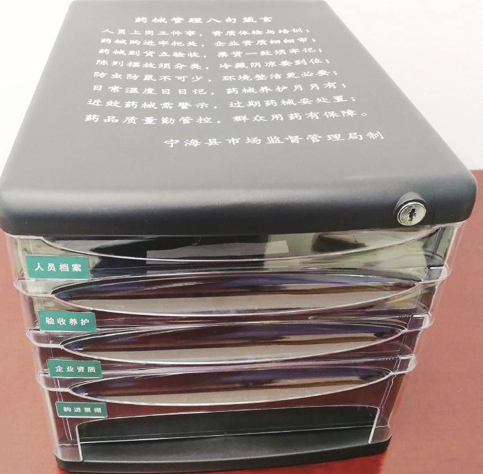 “藥械購銷票據(jù)、購進企業(yè)資質(zhì)材料是各家醫(yī)療機構(gòu)都必須保存的,因此我們就在臺賬盒上動腦筋?!睋?jù)寧??h市場監(jiān)管局藥械監(jiān)管所所長江慧琴介紹,該所統(tǒng)一制作了500個臺賬盒,將“八句箴言”印在盒上,免費發(fā)放給轄區(qū)內(nèi)基層醫(yī)療機構(gòu),強化相關(guān)負責(zé)人和工作人員的責(zé)任意識和藥械安全管理能力。