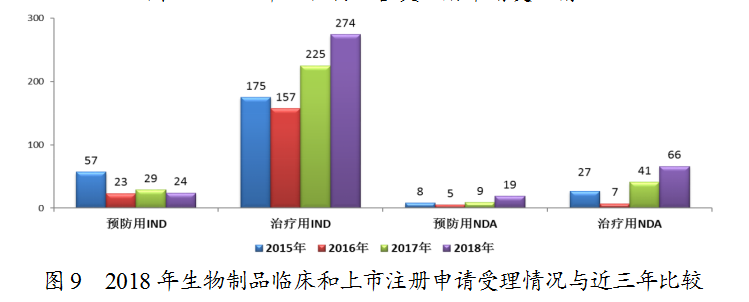 2018年,藥審中心受理1類生物制品創(chuàng)新藥注冊(cè)申請(qǐng)106個(gè)品種(包括預(yù)防用生物制品6件,治療用生物制品117件,共涉及123件受理號(hào)),較2017年增長(zhǎng)了62%。其中,受理1類生物制品NDA 9個(gè)品種(包括預(yù)防用生物制品2件,治療用生物制品9件,共涉及11件受理號(hào)),較2017年增長(zhǎng)了4.5倍。