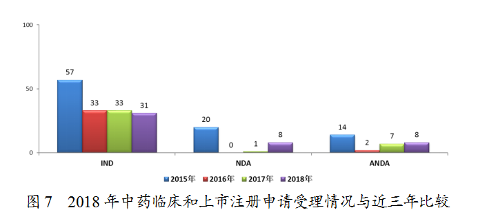 藥審中心受理1-6類中藥新藥注冊(cè)申請(qǐng)39件,其中受理中藥NDA 8件(涉及8個(gè)品種),較2017年增長(zhǎng)了7倍;中藥IND 31件(涉及29個(gè)品種),其中1類中藥創(chuàng)新藥IND申請(qǐng)有2件(涉及1個(gè)品種)。